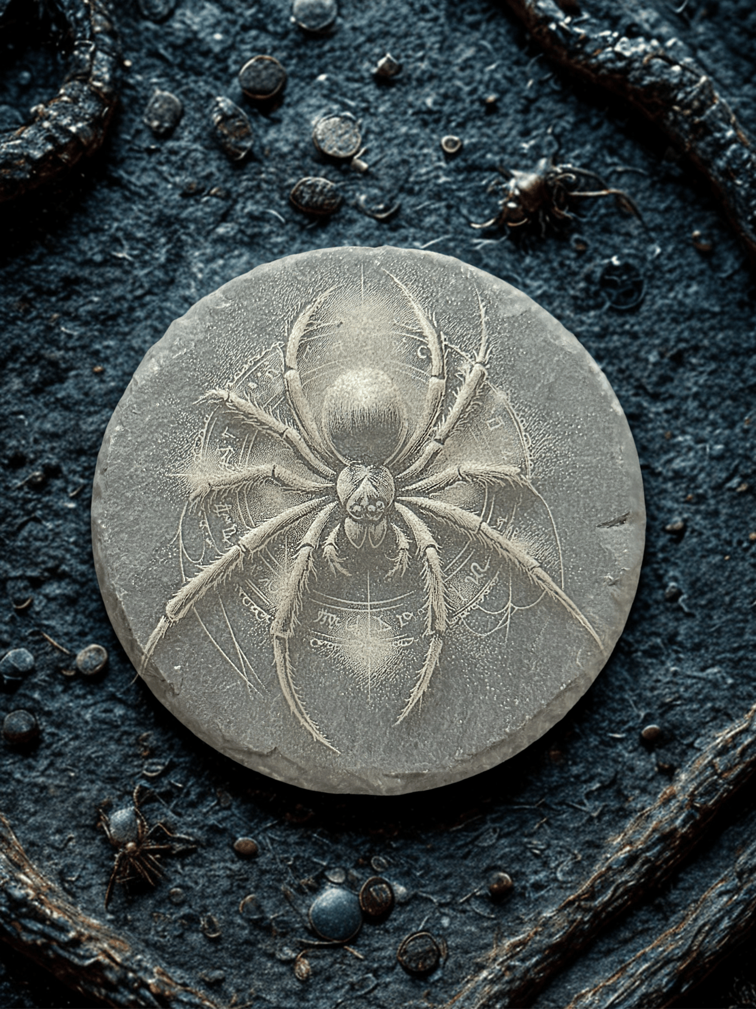 An ancient black widow descends from the shadows, her hourglass glowing like a cursed ember. Every joint, every bristle, every rune-etched leg is laser-carved into midnight slate with unholy precision.