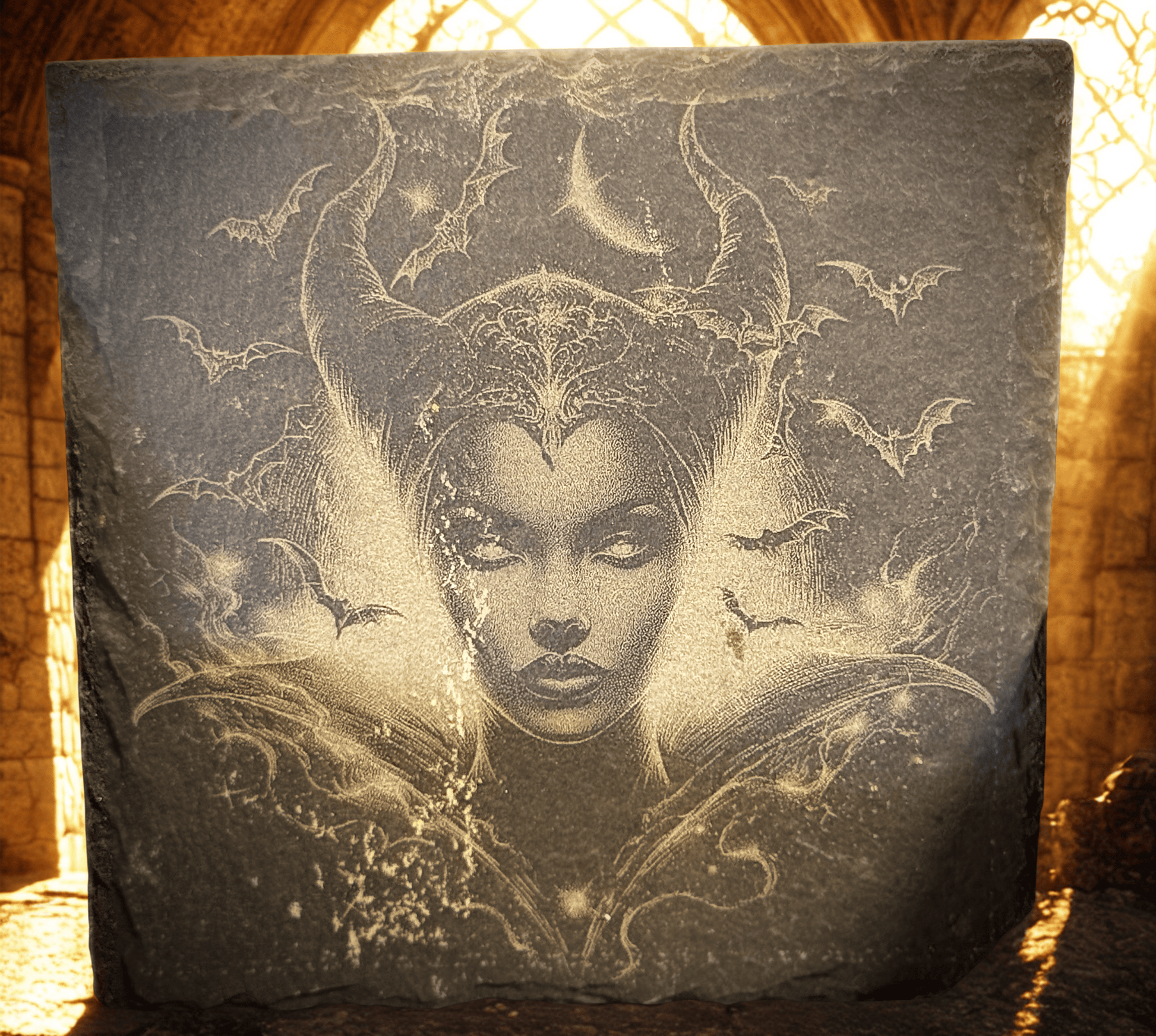 Beneath a crescent moon and swirling bats rises the eternal gaze of the Queen. Laser-etched into midnight-black slate, her regal crown of thorns, razor-sharp collar, and blood-red lips shimmer with hypnotic detail that seems to glow in candlelight.