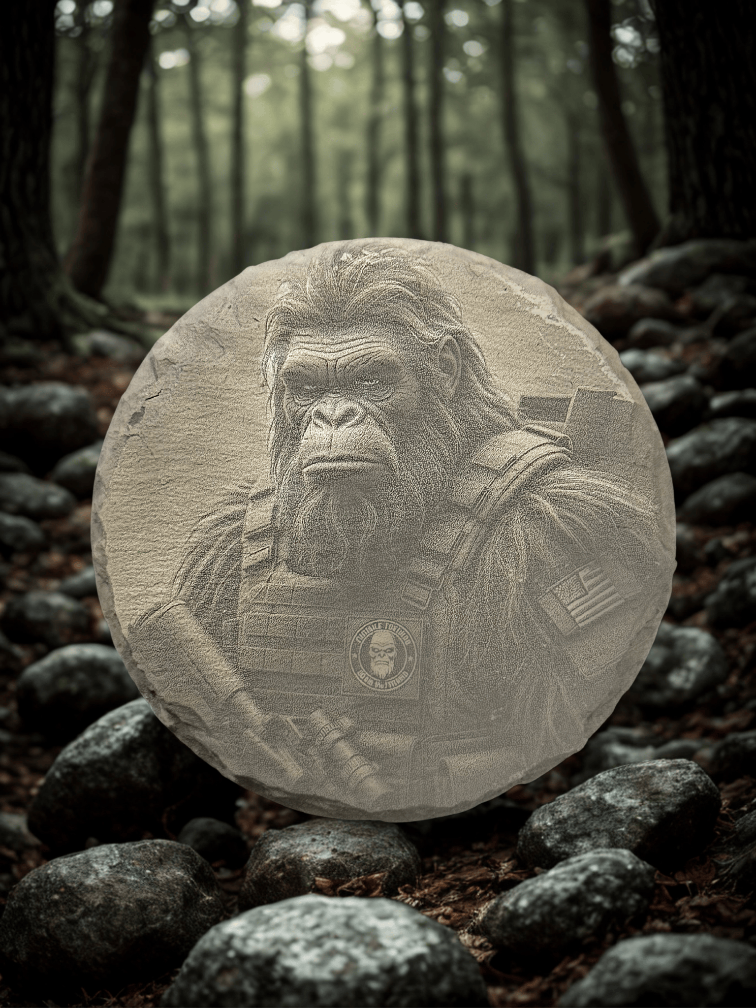 Deep in the woods, one legend stands taller than the rest: Biggie, the patch-wearing, plate-carrier-rocking, freedom-loving Sasquatch. Laser-etched with hair-by-hair detail, he glares out from the slate like he just heard a twig snap behind you.